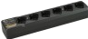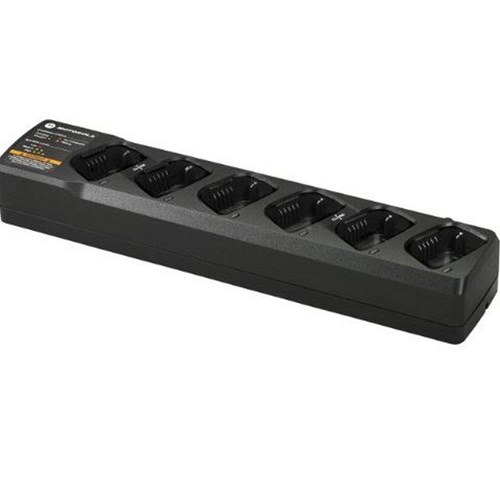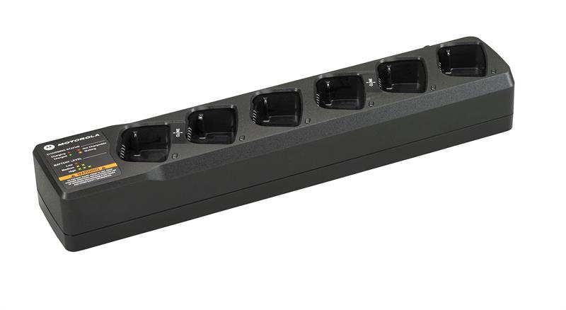 The Motorola PMLN6384 can charge up to six radios or batteries simultaneously. Each pocket includes an LED indicator, providing charge status on each battery. A smart feature detects when there are fewer than six radios in the charger and enables even faster charging.